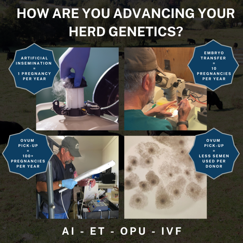 Using Ovum Pick-Up (OPU) to produce IVF embryos provides a powerful advantage for cattle producers seeking to accelerate and control genetic improvement within their herds. OPU allows multiple oocytes to be collected from elite donor cows in a minimally invasive procedure that can be repeated frequently, even in open or early-pregnant females, without the need for hormonal stimulation. Because IVF requires significantly less semen per embryo than conventional breeding, producers can efficiently leverage high-value or limited-availability sires while maximizing the genetic output of top donors.