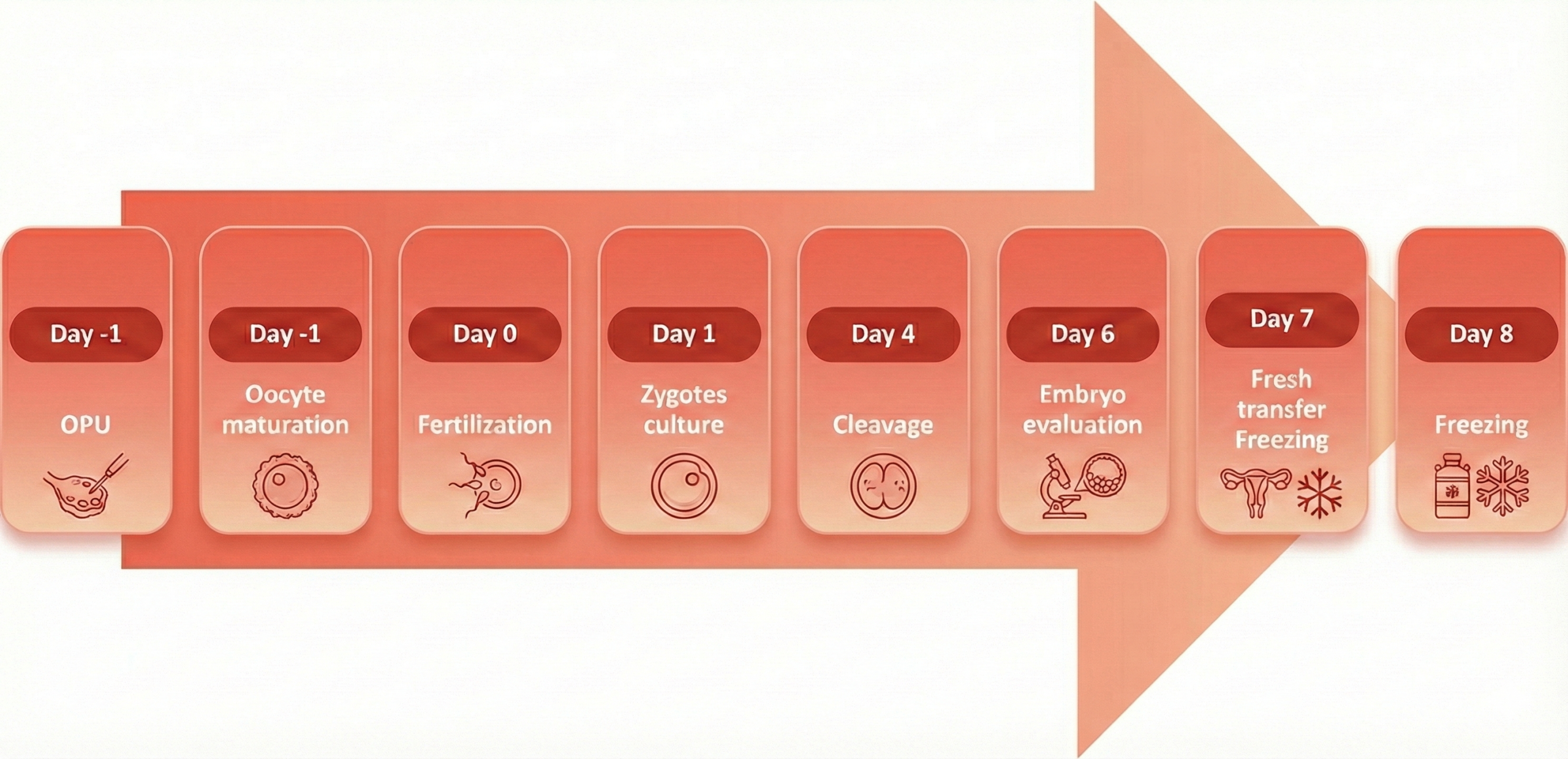 This OPU/IVF timeline outlines the controlled laboratory process used to produce high-quality bovine embryos from donor females. The procedure begins on Day -1 with Ovum Pick-Up (OPU), during which immature oocytes are collected directly from the donor cow’s ovaries using ultrasound guidance. Immediately following collection, these oocytes undergo in-vitro maturation, allowing them to reach the developmental stage required for successful fertilization.